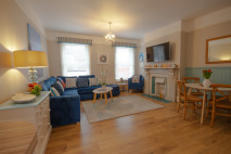We have designed this room with a dual purpose as we realise that different families and groups have different needs. This room again has a seaside feel with soft carpeting, leather sofa, stripey armchair, sideboard and flat screen tv - a great tv room for children. However the sofa is in fact a sofa bed, so the room easily transforms into another bedroom if required.